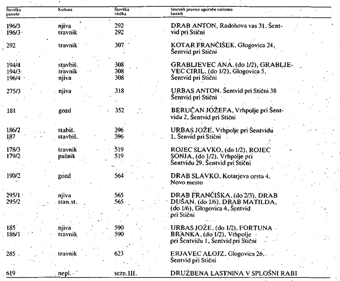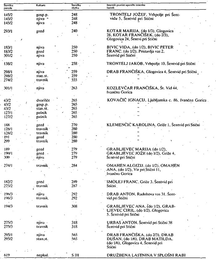 Na severni strani poteka meja po poti Stična -Pristavlja vas, in sicer po severnih robovih parcel št. 514, 513, 501, 500, 502, 509, 508 (vse k.o. Stična), 569, 572/1, 573,. 575, 484, 483, 481/1, 482, 488, 487/1, 489, 466, 464 in 426 (vse k.o. Šentvid), kjer na severovzhodnem vogalu zadnje parcele zavije proti jugu in teče po vzhodnih robovih parcel št. 462, 461/4, 465, 467, 491, 501,. 502, 503, 516, 517 in 519. Tu prestopi cesto Ivančna Gorica-Šentvid in poteka v k.o. Radohova vas po robovih parcel št. 302/2, 302/1, 296/1, 294, 292, 275/3, 273, 194/3, 182/2, 182/1, 177, 178,.128, 134, 141, 142, 139/2, 145/1, 145/2 in 145/3, kjer doseže najjužnejšo točko. Nato teče proti zahodu ob železniški progi Ljubljana – Novo mesto, in sicer po južni strani parcel štev. 151,. 152/1, 114/1, 113/2, 115/1 in 116/1. Na jugozahodnem vogalu parcele št. 59/1 se meja usmeri proti severu in teče po zahodnih robovih parcel št. 59/1, 32/1, 16/1, 14/1, 9/2, 13/9, 13/8 in 10/2, kjer prestopi v k.o. Stična. Meja se nadaljuje po zahodnih robovih parcel št. 751/2, 750/1,.750/17, 750/12, 750/9, 750/2, 756, 745, 744, 709/1, 710/14, 710/5, 710/4, 710/1, 710/7, 715/3, 715/2, 711/53, 711/13, 711/6, 711/5, 712/7, 712/8, 524, 522, 519, 517 in 514, kjer se na severozahodnem vogalu zadnje parcele sklene.