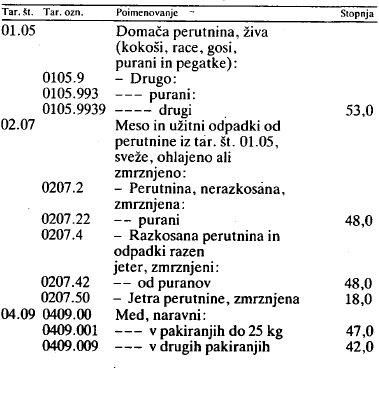Posebna taksa na uvoženo blago po predpisanih stopnjah od carinske osnove se v letu 1994 plača pri uvozu blaga iz naslednjih tarifnih številk carinske tarife: