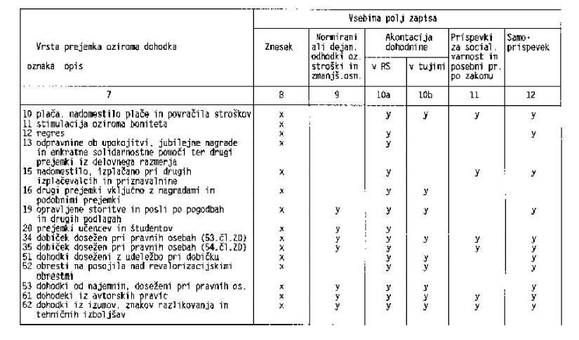 Opomba: v to tabelo se obvezno vpišejo oznake vrst dohodkov (dvomestna števila) iz tabel vrst dohodkov in obveznosti!