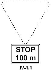 34) znak "približevanje prehodu ceste čez železniško progo brez zapornic ali polzapornic" (I-40), ki označuje razdaljo do prehoda ceste čez železniško progo v ravnini, ki ni zavarovan z zapornicami ali polzapornicami.