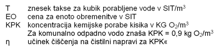 Če se odpadna voda odvaja v kanalizacijo, ki je zaključena z javno čistilno napravo, se za vsak kubični meter porabljene vode plača taksa, ki je zmanjšana za enote obremenitve za KPK, ki ga je odstranila javna čistilna naprava in se izračuna po naslednji formuli: