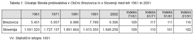 V zadnjih tridesetih letih je območje občine Brezovica beležilo hitrejšo rast prebivalstva v primerjavi s Slovenijo. Naravno in selitveno gibanje prebivalstva v drugi polovici 90-ih let je bilo vseskozi pozitivno (Tabela 2).