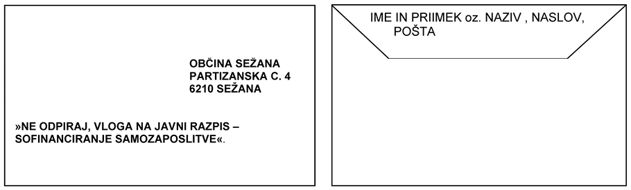 11. Popolne vloge z vsemi zahtevanimi prilogami pošljejo vlagatelji v zaprti kuverti na naslov: Občina Sežana, Partizanska cesta 4, 6210 Sežana. Na prednji strani kuverte mora biti na vidnem mestu napis »Ne odpiraj, vloga na javni razpis – Sofinanciranje samozaposlitve«. Na hrbtni strani kuverte mora biti označen naziv in polni naslov vlagatelja. Kot pravočasne vloge se štejejo vloge, oddane do vključno zadnjega dne roka za predložitev vlog – do vključno 22. 5. 2020 osebno v sprejemni pisarni v poslovnem času ali oddane priporočeno po pošti.