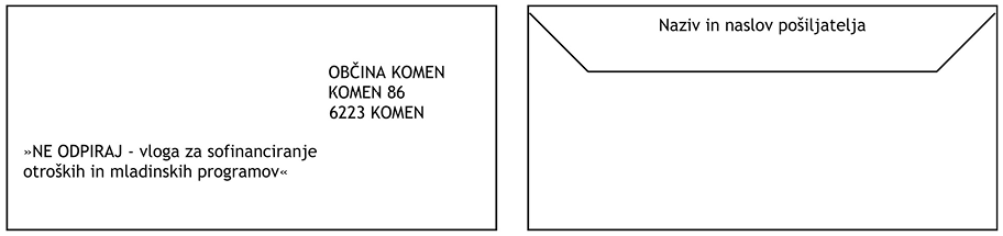 Vloga mora biti oddana osebno v sprejemni pisarni Občine Komen ali pa poslana po pošti na naslov: Občina Komen, Komen 86, 6223 Komen v razpisanem roku, v zapečatenem ovitku z izpisom na prednji strani: