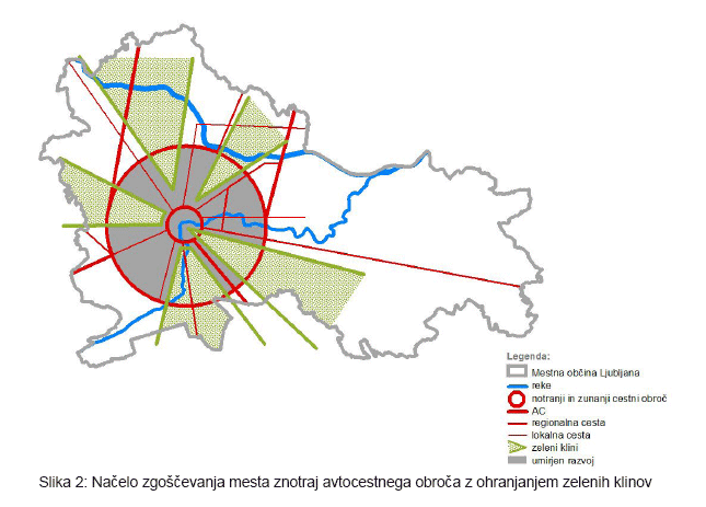 Slika 2: Načelo zgoščevanja mesta znotraj avtocestnega obroča z ohranjanjem zelenih klinov