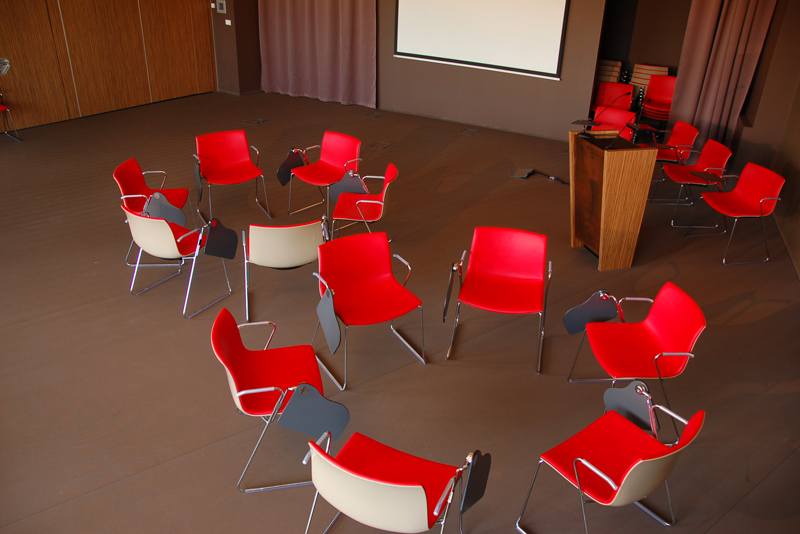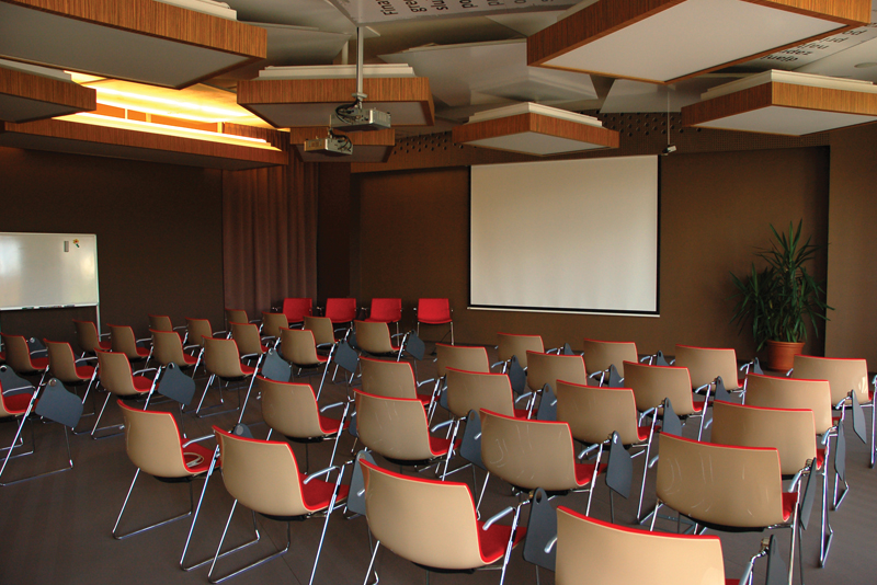 | 2 projektorja LCD (možnost sočasnega projiciranja dveh prezentacij) | stoli z mizicami za pisanje (možnost različnih postavitev) |